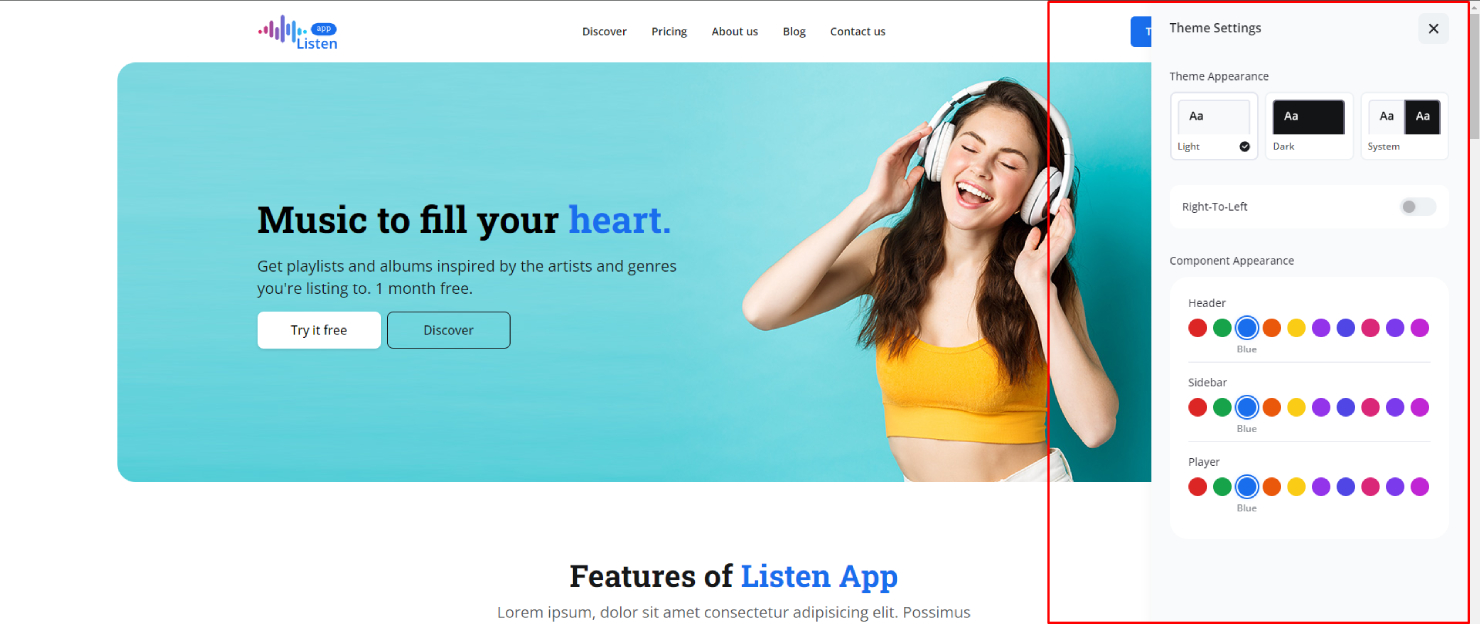 The template offers you the ability to modify both the template skins and text direction through the settings