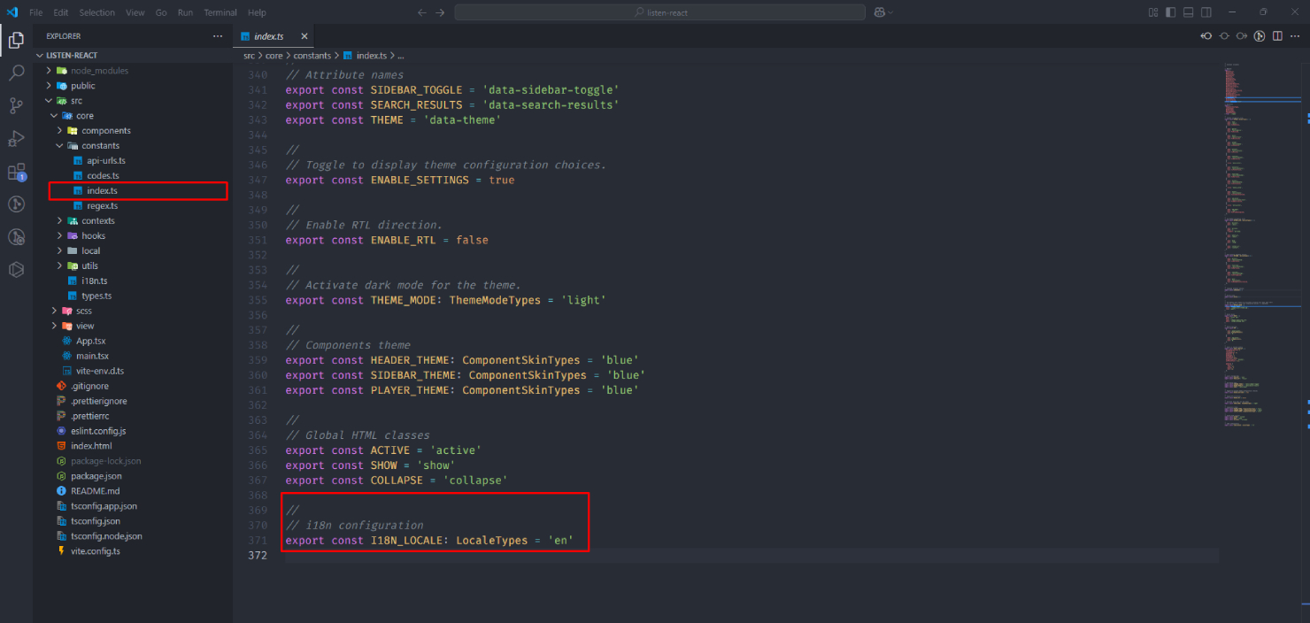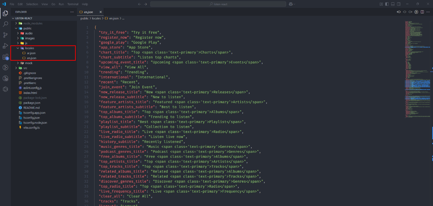The template includes built-in internationalization (i18n) support for easy adaptation to various languages. Language files are organized within the locale directory under their respective names. To modify languages, open the template in your editor and follow the instructions in the provided screenshot.