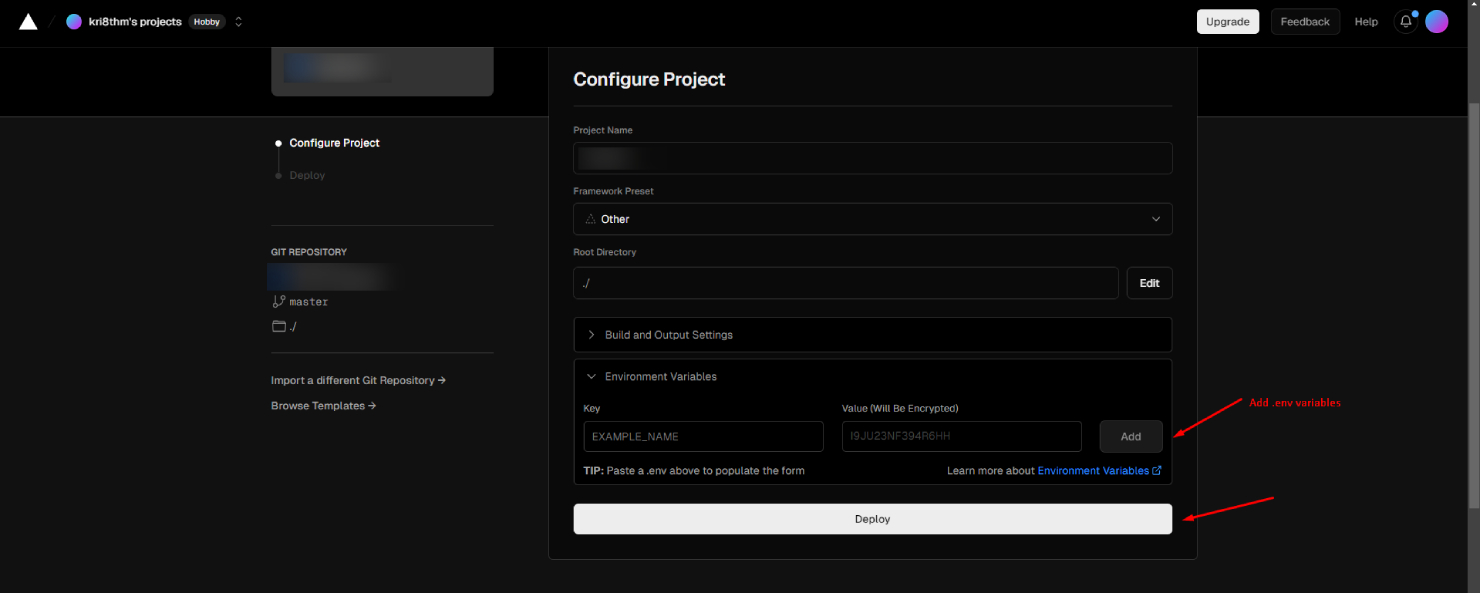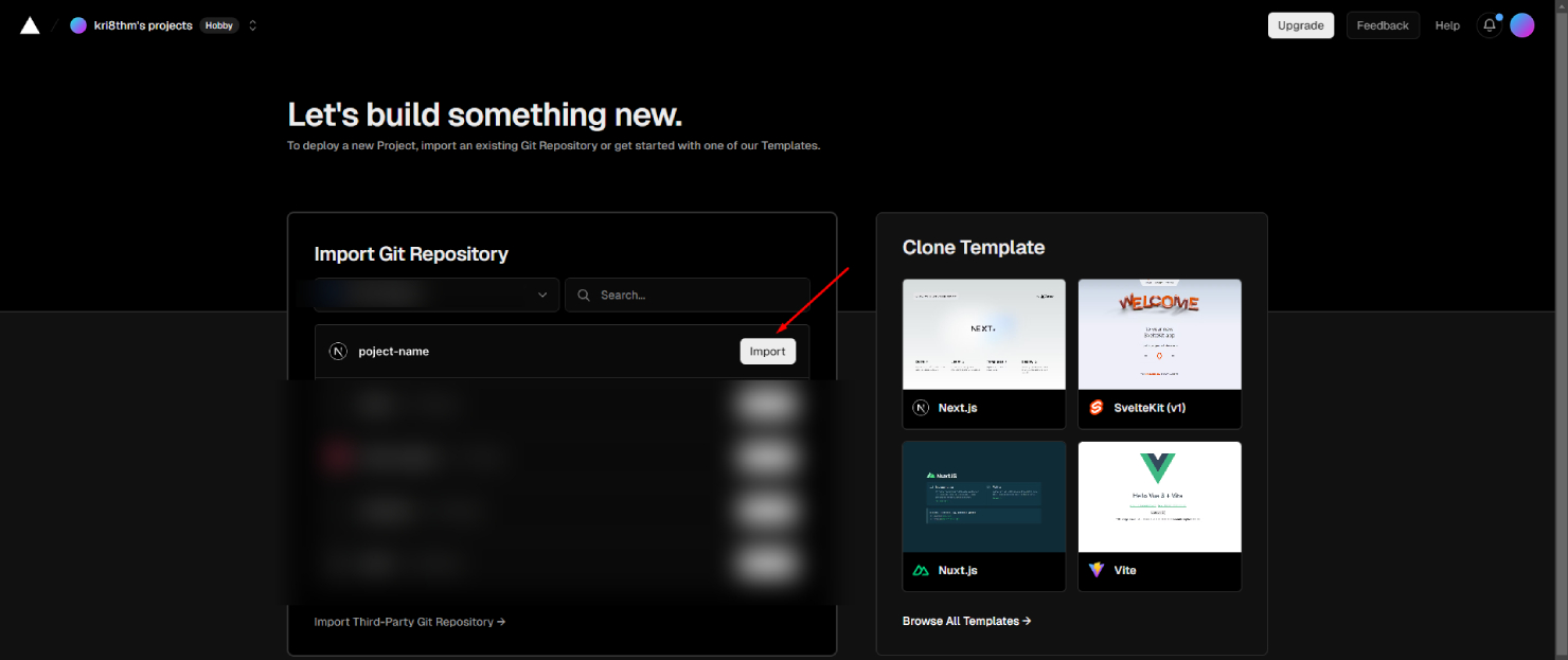 To deploy a template on Vercel, you need to have a Git repository and be logged in to Vercel with the account that has access to the repository. Follow the steps below: